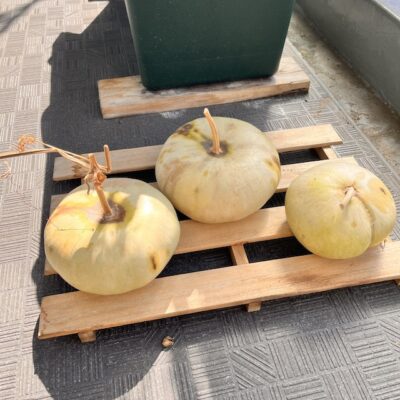 2月14日、収穫第三弾。左から、「13号」「14号」「15号」です。すべて9月以降に受粉を行なった後成りの実たち。表面にシミができてしまいましたが、形は崩れずに残りました。この3個は、近いうちに水浸け処理を行おうと思います。