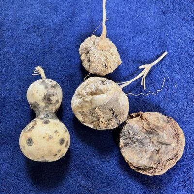 写真⑤の「16号」は、蔓が切れてしまいそうだったのでアミ袋に入れて保護していたところ、袋の中で完全に乾いてしまいました。直径18センチ、高さ8センチですが、持ってみると拍子抜けするくらい軽い!表面にカビ模様が均一についていて、大変きれいです。このひょうたんもわざとは作れない。自然の造形美を感じます。