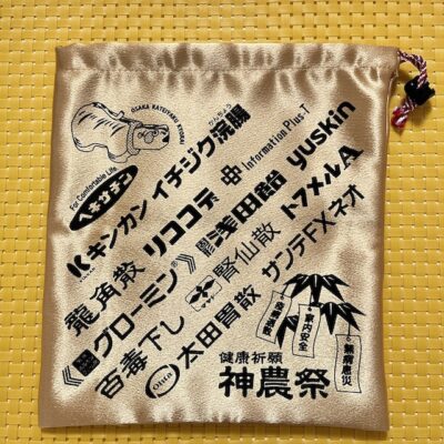 それは薬のまち、大阪・道修町の「神農さん」こと「少彦名神社」で、11月の「神農祭」で授与していただける健康祈願のご祈祷済み袋でした。私も日頃からお世話になっている家庭常備薬の商品名ロゴが、袋の両面にびっしり印刷されています(写真①②)。その名も「健康応援し袋(たい)」(写真③)。ネーミングセンスがいかにも薬屋さんらしい。