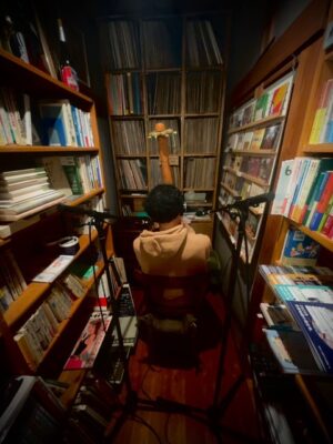 そこで、レコーディングエンジニアの金澤Bull君と相談して、マイクを変えたり位置を調整したり、エフェクターで少し加工したりといろいろやってみています。《ビビリンチョ》のレコーディングは今回で3回目。毎回、いい感じにいけたかな、と思うのですが、何度も聴くうちに欲が出てきて、もっとこんな感じにできないか、などと妄想が立ち上がり、別の方法を試してみたりしています。今回はできるだけ外部のノイズが聞こえない環境の中で、複数のマイクを使って録ってみることに。しかもマイクに背を向けて後ろから。