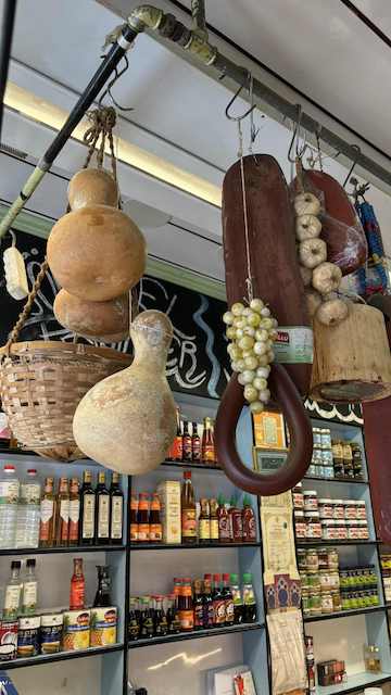 まずは写真①をご覧ください。こちらはイスタンブールの商店街にある食料品店です。後ろにソースの瓶や、果物の缶詰などが並んでいるのが見えます。ハムやソーセージ、ニンニク、ブドウなどは天井から下げてディスプレイされていますね。