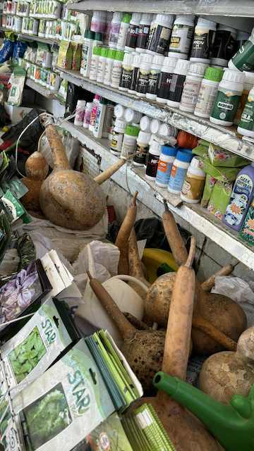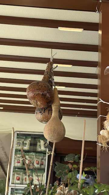 このお店は、商店街の中の園芸店が集まっているエリアにあって、食料品店巡りの時にたまたま通ったので入ってみたとのこと。ひょうたんがなぜ置いてあったのかは謎だそう。やはり何かの容器として使うのかな?ひょうたんに書かれた文字が読めたらわかるかもしれませんね。
