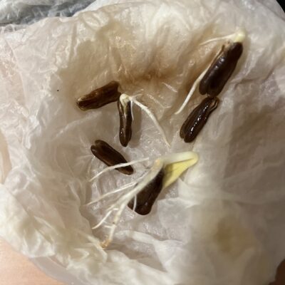まずは写真①を見てやってください。いちばん上のタネから、白いツノのようなものが出ているのがわかるでしょうか?これがひょうたんの根なんです。ひょうたんのタネからは芽よりも先に根が出るのですが、幼根が出た状態を発芽と呼んで間違いないそうです。写真①は「大瓢エース」のタネで、よく見ると合計2つ発芽していました。