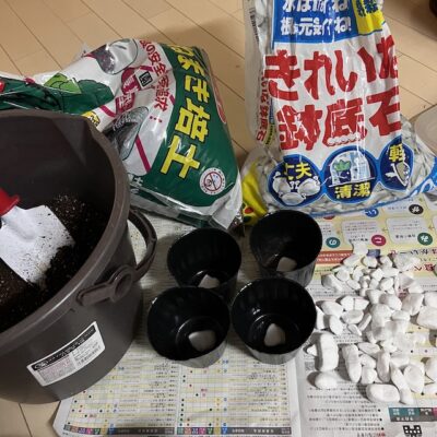 まずは、「タキイのたねまき培土」をバケツに2リットル入れ、そこに水を100cc入れて、シャベルで空気を含ませるように良く混ぜました。ビニールポットに鉢底石を1個置き、淵まで土を入れてトントンと軽く落とすと、ちょうどいい土の量になります。その真ん中に窪みをあけて、根を下向きにしてタネを置き、スプーンで土を被せます。覆土はだいたい1センチくらいが良いそうです。